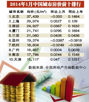 日前,全国房地产市场数据中心统计的《2014年1月全国城市房价排行榜前100名》火热出炉,1月全国城市房价排行榜前10名分别是北京、上海、深圳、厦门、三亚、温州、杭州、广州、南京、天津。其中,厦门以21741元/平方米的房价,超过广州位列全国第4,同比上涨18.94%。此外,福州房价以14066元/平方米,位居全国第11,同比上涨15.48%;泉州房价以8036元/平方米,位列全国31,同比上涨3.12%。