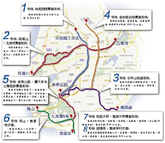 吴振志介绍,步道建设遵循实用原则,主要是适宜大家出行的线路,将繁华商业街区串联,将风景区相连,成为城市、海洋、河流、山体之间的生态绿色廊道。以2号线(狐尾山-五缘湾)慢道系统为例,它连接起狐尾山、仙岳山、虎头山、五缘湾等风景区,打造成一条东西走向、连山通海的绿道。山体间的道路该如何穿过城区?市规划局建议,在跨越城区道路的山体之间可以采取架高的形式,比如建造城区通山跨桥,避免与平面道路交通交叉。