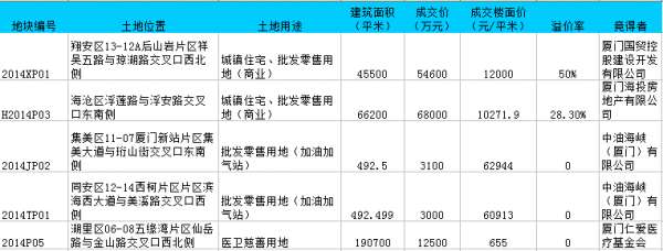 2014年4月23日上午,厦门出让5幅经营性用地,共成交14.12亿元。其中,2幅为商住用地。海投以6.8亿元竞得海沧东孚的H2014P03,楼面价10271.9元/㎡,溢价率28.3%;国贸以5.46亿竞得翔安2014XP01,楼面价12000万/平,溢价率50%。