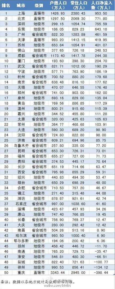 据新浪财经报道,经济发达城市优质的社会公共资源对流动人口形成了强大的吸引力。《价值线》杂志数据中心选取了2013年中国公共财政收入最高的50个城市,对城市的人口吸引力进行排名。