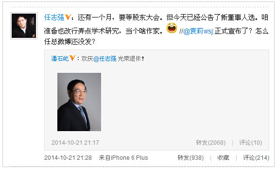 任志强在微博上表示即将退休,“还有一个月,要等股东大会。但今天已经公告了新董事人选。咱准备也改行弄点学术研究,当个啥作家。”