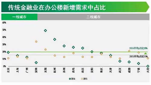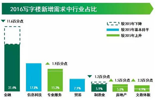 2016年金融行业成为写字楼市场新增需求的主要来源,占比31.4%。虽然P2P行业退潮影响使得非传统金融业呈现调整,但金融业仍在持续增长,未来一年金融行业对于写字楼市场的直接需求将更多来源于传统金融企业的业务创新、混业经营、业务拓展等。