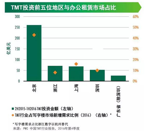 科技行业因行业整合迅速,办公楼需求呈现增长迅捷而多变的特点。在2016年TMT领域的投资仍保持较高速增长,这意味着TMT行业在2017年的继续扩张在资金层面有相当的保障。北京、上海、深圳、浙江和广东是TMT投资最为活跃的区域,电子商务和互联网金融是当前吸引投资最多的子行业——这也深深的影响了其写字楼租赁。