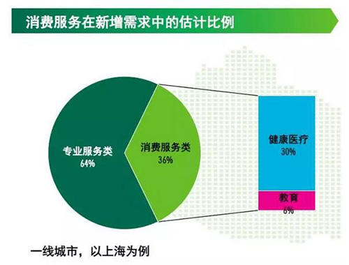 在消费升级大趋势推动下,中国服务业产值在2017年有望继续以8%左右的速度保持高速增长。以教育和医疗为代表的消费服务类租户成为写字楼市场的新兴力量,在2016前三季度市场需求中发现,此类租户在一二线城市都占到专业服务类租户新增需求的30%以上。