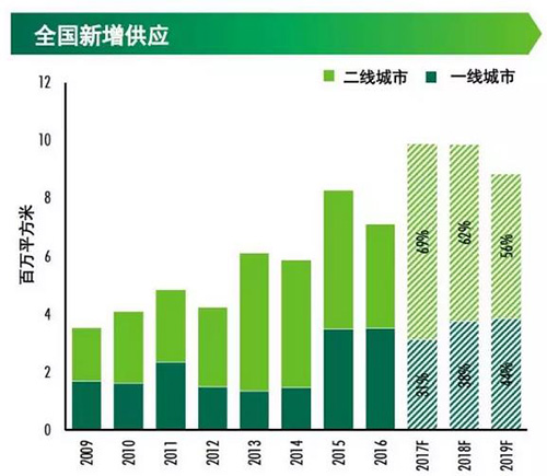 2017年全国17个主要城市优质写字楼新增供应初值预计将接近1,000万平方米,比2016年实际交付量增幅超过19%。考虑到国际政治经济环境的不确定性和中国经济增速趋缓,开发商可能延迟供应。考虑15%的延误率,未来三年市场将迎来写字楼供应高峰,预计总量约在2,300万平方米。