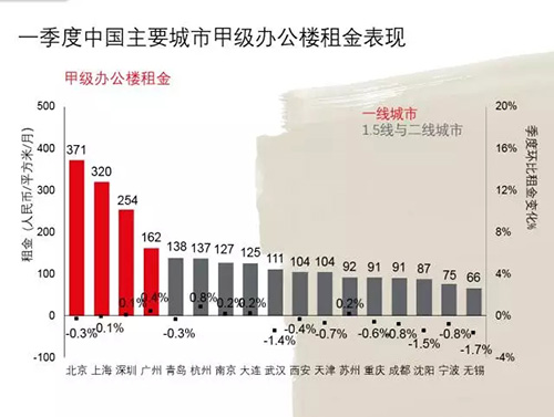 在1.5线和二线城市,大量企业在本季度继续利用租金持续下调的时机,纷纷实现升级、扩张需求,其中以科技、教育、设计、贸易类企业尤为突出。但绝大部分市场仍处于新增供应的高峰期,空置率水平居高不下。诸多城市的市场平均租金仍处于调整状态。