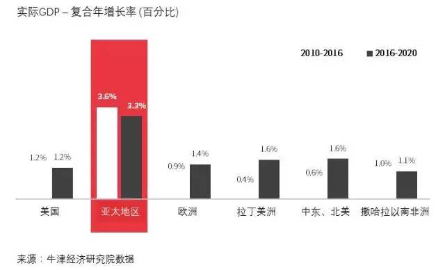 亚太区自2010年起便引领着全球经济的增长,并且在未来数年将延续这一趋势。2020年前,亚太区的GDP年增长率保持在约3.3% 的水平。