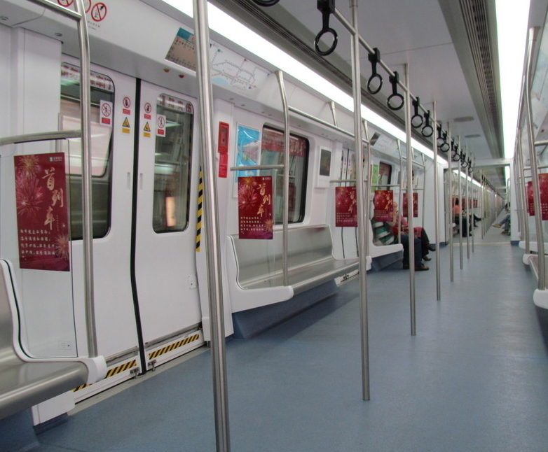 1号线地铁车厢的主色调橙红色随处可见,如座椅屏风、拉环等。在每排座椅前设有6个360°球柱柔性拉环,每个车厢共计有36个拉环。摸一摸座椅表面,能感觉到压花的凹凸感,这是为了增加摩擦力,防止乘客在车辆刹车时,因惯性而发生滑动。