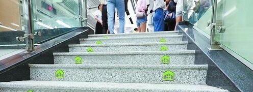 地铁屏蔽玻璃门上贴着黄色安全警示标志“小心夹手,小心站台间隙”。屏蔽门前的地上有标识线,绿色箭头指示下车方向,白色箭头指示上车方向。箭头后面是黄色的安全区域标识线。屏蔽门上方有中英文标识的地铁站点线路图。