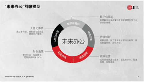 全球领先的房地产领域专业服务和投资管理公司仲量联行在一年多前就开始研究,并开创了一个专属模型——“未来办公”——旨在探究和展望不断改变的工作环境及对下一代企业不动产影响。“未来办公”模型包含五大维度:人性化体验、持续创新、数字化驱动、财务表现和高效运营,五大维度相互关联,相互影响。