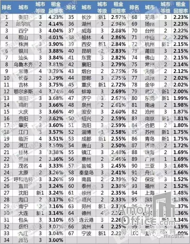 如果要计算实际租金回报率,应该是(1年租金-房屋保养费)/房屋价格,在这里,我们是直接用1年租金/房屋价格,得出的数据会略高,特此先说明。以下是100个城市的租金回报率总榜排行。