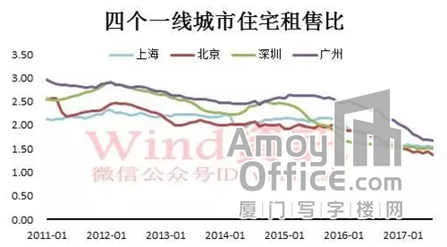 从租售价格上看,一线城市尽管房租不断上涨,但对于过高的房价,租售比却在持续下降,即租金上涨远远跑不赢房价的上涨。Wind资讯统计显示,四个一线城市租售比一直处于下降通道中,四个城市中,北京的租金回报率最低,以1.37%在百城里排名第96位,其次是深圳(1.38%)、上海(1.48%)和广州(1.69%)。