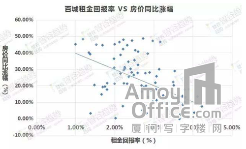 从图表中我们可以看到一个规律:城市越大租金回报率越低。