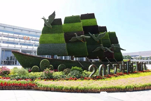 ▲厦门国际会展中心,高12米、长25米的“驶向未来”大型绿雕迎着晨光展现风采。