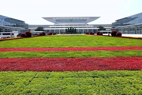▲厦门国际会展中心,鲜艳的花球、精心设计的绿雕营造出喜庆的氛围。