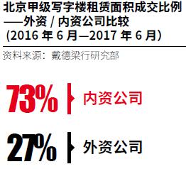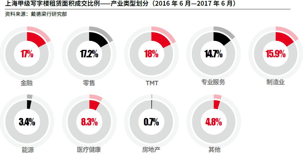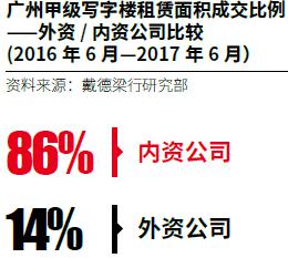 自2016年第三季度至今,广州写字楼租赁市场持续保持活跃。在所有企业中,内资企业表现非常突出,2016年6月至2017年6月期间,内资企业的吸纳量占比达到了86%。金融、专业服务和TMT产业已成为推动该市写字楼需求的主力军。