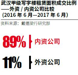在过去的12个月内,武汉写字楼市场迎来了辉煌的一年。该市的写字楼需求同比激增超过177%,其中内资企业占绝对主导地位,租赁面积比例达到89%。武汉的许多企业都在寻找更高标准和更优越地理位置的写字楼。事实上,在全年的时间里,48%的办公室租赁交易的目的都是办公空间升级。