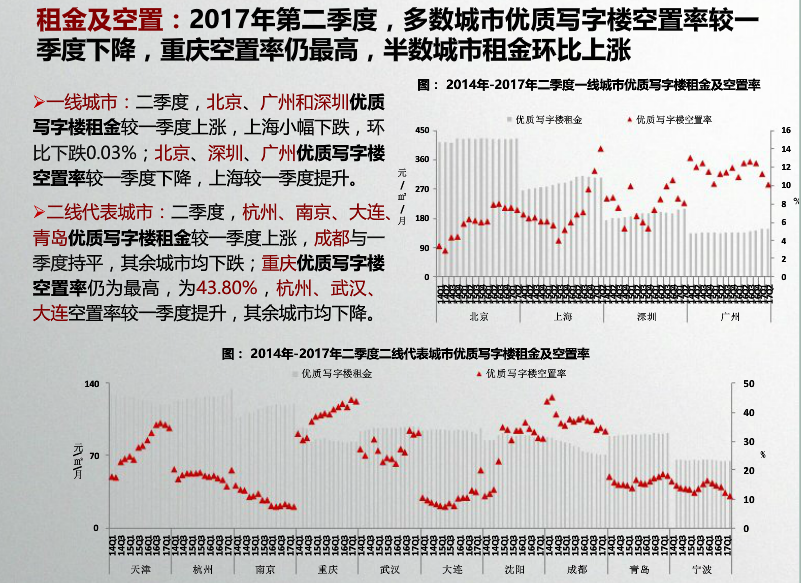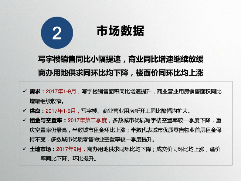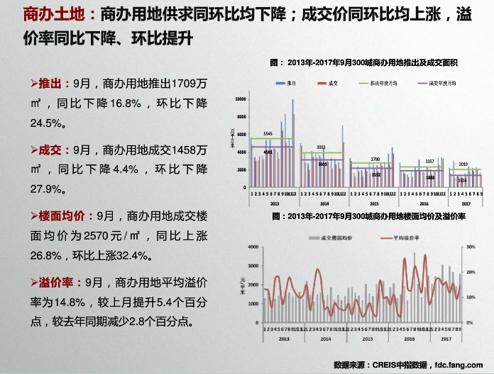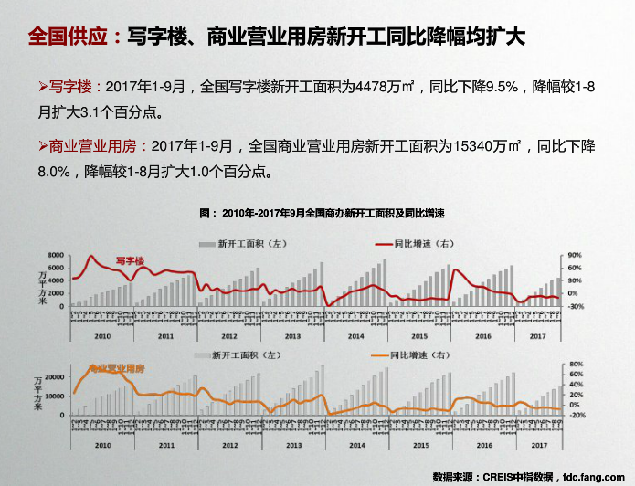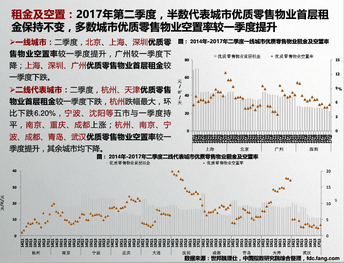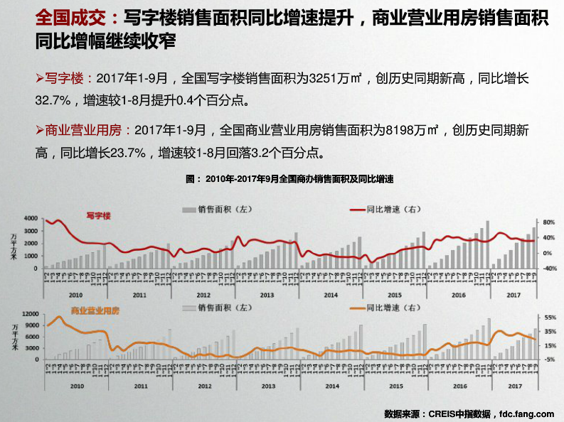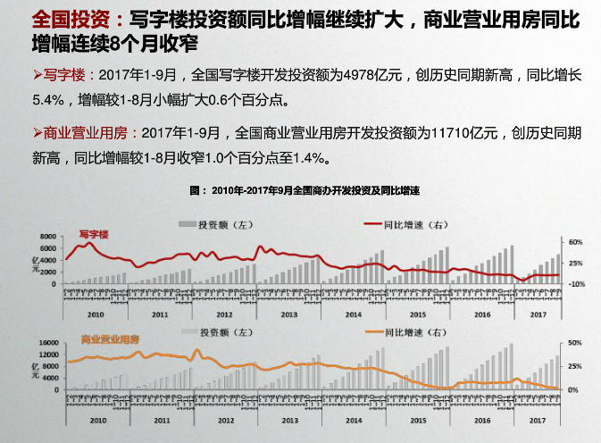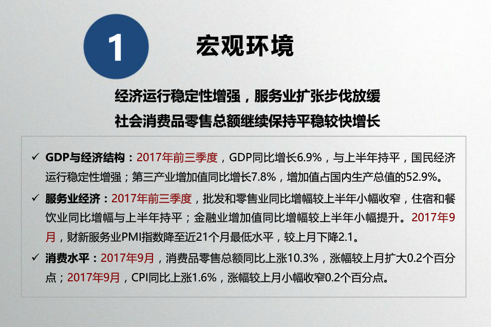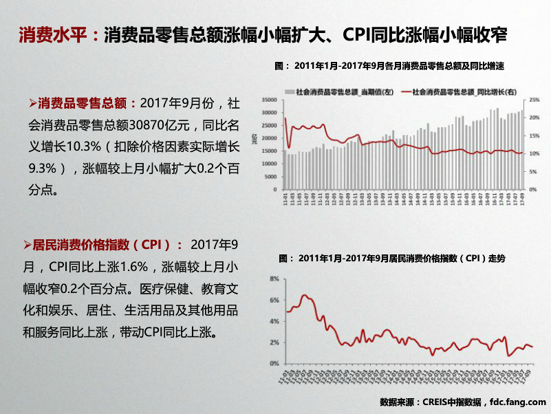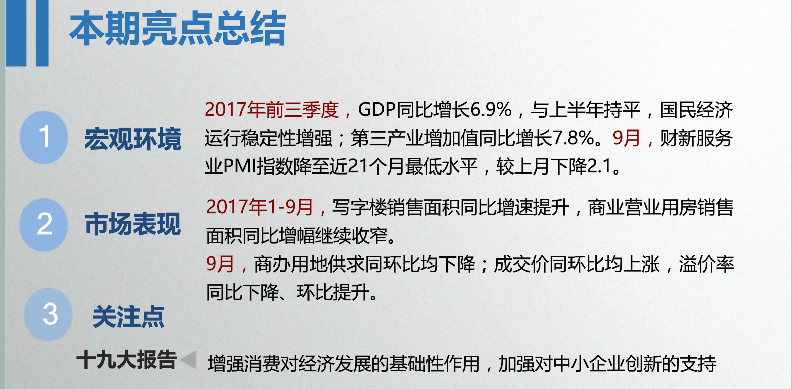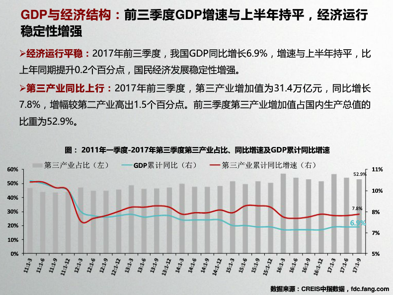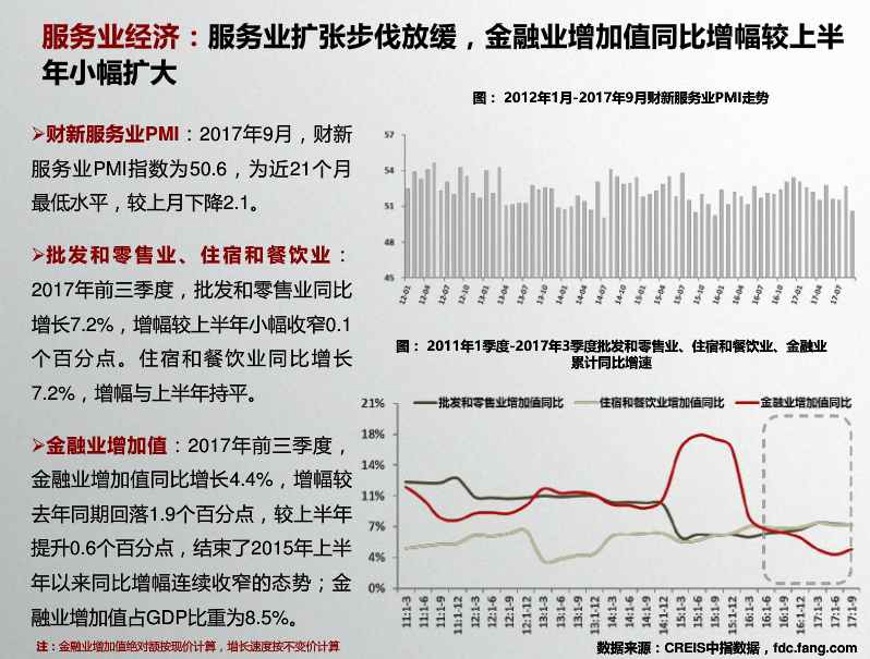 收藏 中指院:2017年10月全国商业地产市场月报 发布时间:10-31 09:55 分享到: 宏观环境:2017年前三季度,GDP同比增长6.9%,与上半年持平,国民经济运行稳定性增强;第三产业增加值同比增长7.8%。9月,财新服务业PMI指数降至近21个月最低水平,较上月下降2.1。