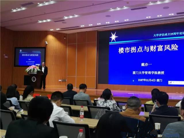 11月4日下午,在厦门国家会计学院举办的大学评估成立25周年“发现价值 成就梦想”高峰论坛上,厦大管理学院经济学与金融学教授、博士生导师,厦门大学金圆研究院理事长戴亦一,发表了主题为“楼市拐点与财富风险”的演讲。