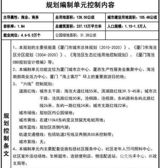日前厦门市规划委公布《厦门市海沧区新市区南05-11编制单元控制性详细规划(局部修编)》。规划显示,海沧新市区南被定位为城市次中心,总用地面积128.5公顷,总建237.13万平,规划常住人口1.15—1.3万人。具体规划如下:
