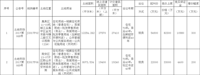 (一)J2017P02及X2017P06地块:采用“限地价、竞配建”方式拍卖出让,不设拍卖底价。当拍卖竞价达到竞价上限价格时,不再接受更高报价,转为竞报无偿移交政府的居住建筑面积(以下简称“竞配建面积”)。每次竞报竞配建面积应不少于500平方米,竞报竞配建面积最高者为竞得人。成交土地出让金即为竞价上限价格。关于竞配建面积移交要求详见出让文件中的出让合同。