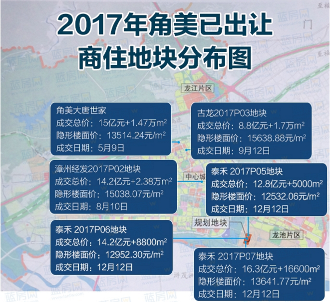 今年下半年,角美土地市场热度完全盖过与之相邻的厦门。8月10日,漳州经发以14.2亿元拿下角美2017P02地块,扣除竞配建楼面价为15039元/㎡,刷新角美地王纪录。仅仅1个月后,古龙就以15638.88元/㎡的隐形楼面价拿下角美2017P03地块,再刷角美地王纪录。