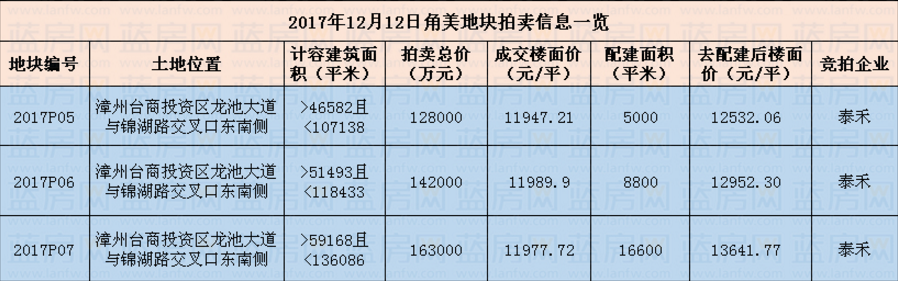 继9月古龙首入角美称王后,暌违3个月,今日(12月12日)角美再迎土拍,采用“限地价、竞配建”方式拍卖出让3幅商住地,总建筑面积高达36.17万方,起拍总价33.7亿元。最终三幅地块均被泰禾拿到,成交总价43.3亿元,配建面积30400平,最高隐形楼面价1.36万/平。