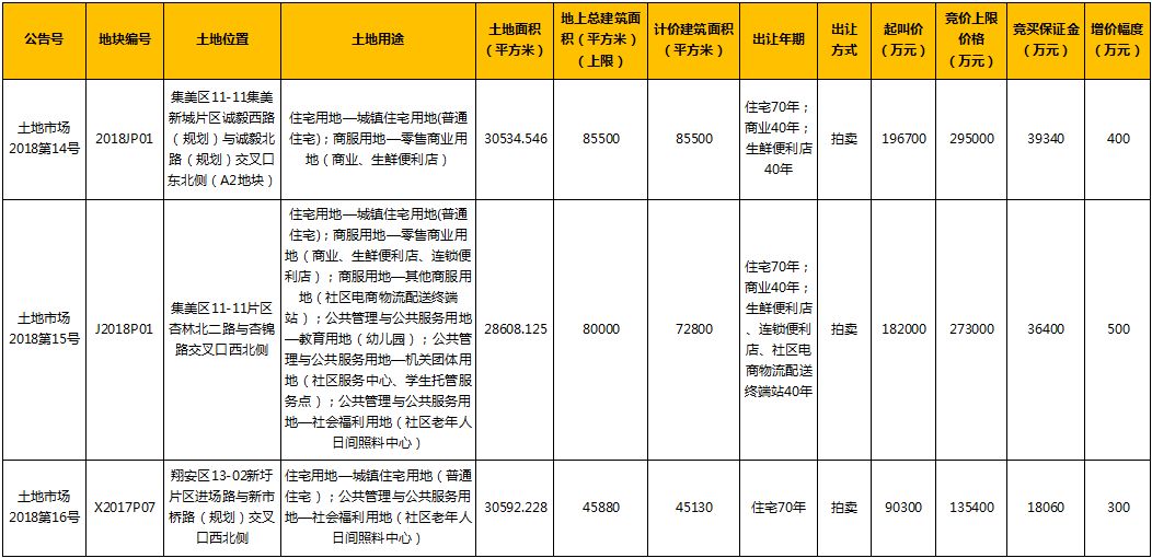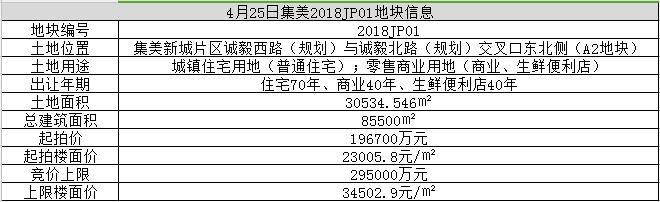 1.集美新城2018JP01地块:起拍楼面价23005.8元/㎡,上限楼面价34502.9元/㎡