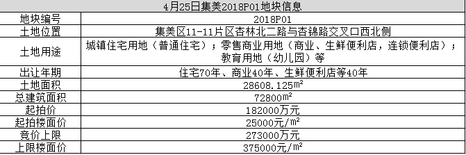2.集美杏林J2018P01地块:起拍楼面价25000元/㎡,上限楼面价37500元/㎡