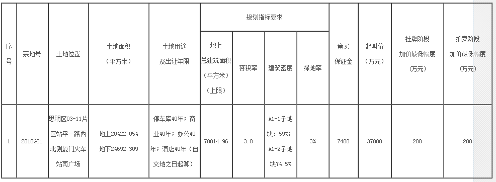 收藏 快讯!厦门市政3.7亿底价竞得火车站南广场商办地块 发布时间:05-08 11:09 分享到: 今天(5月8日)上午,2018G01地块被厦门市市政建设开发有限公司以底价37000万元竞得,楼面4742.68元/㎡。 今天(5月8日)上午,2018G01地块被厦门市市政建设开发有限公司以底价37000万元竞得,楼面4742.68元/㎡。 该地块位于思明区03-11片区站平一路西北侧厦门火车站南广场,总建筑面积78014.96平方米,起叫价37000万元,用途为商业办公、停车库、酒店。