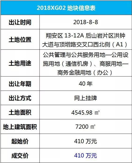 收藏 中国电信以410万元竞得翔安2018XG02经营性用地 发布时间:08-09 09:00 分享到: 中国电信以410万元竞得翔安2018XG02经营性用地 2018年8月8日,翔安区13-12A后山岩片区洪钟大道与顶增路交叉口西北侧(A1)2018XG02经营性用地(通信机房、办公),在我市土地矿产资源交易市场网上挂牌成交。