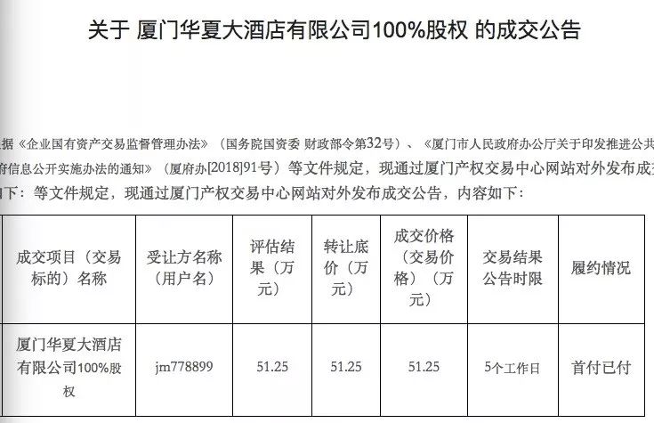 如今,这家酒店的股权已被悄然转让。根据厦门产权交易中心发布的公告,近期,厦门华夏大酒店有限公司100%股成功完成转让,转让价为51.25万元。据悉,这也是此次公开转让的底价。该项目的转让方,为厦门华夏国际电力发展有限公司工会委员会。