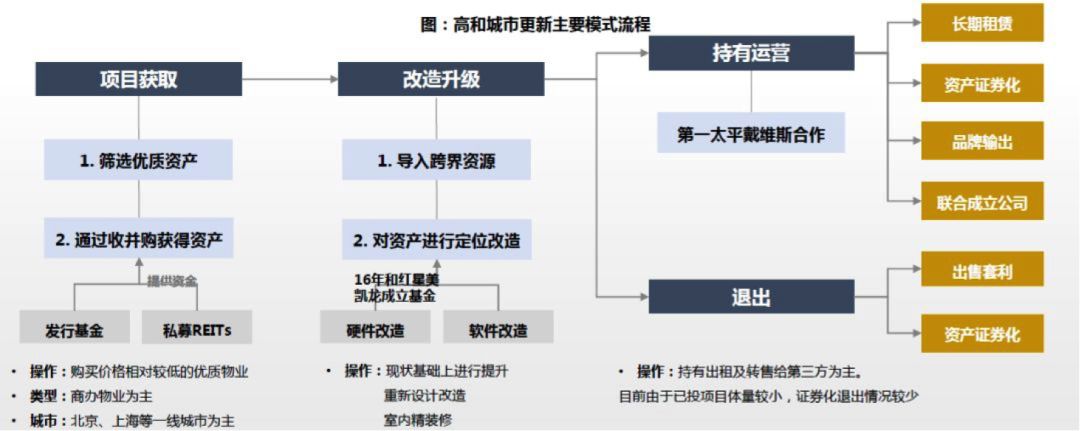 房地产基金作为新城市更新的早期参与者,根据专业判断力寻找并收并购资产。其通过发行基金和私募REITs来获得资金,整体购入有增值空间的物业后,引入跨界资源对其再定位、改造,以增加租金回报率、提升物业估值。16年通过和红星美凯龙成立基金来进行硬件和软件改造。由五大行为高和资本运营管理,业务包括长期租赁、资产证券化、品牌输出、联合成立公司等。部分物业运营成熟后,将通过资产证券化或出售方式退出,获取资产增值收益。