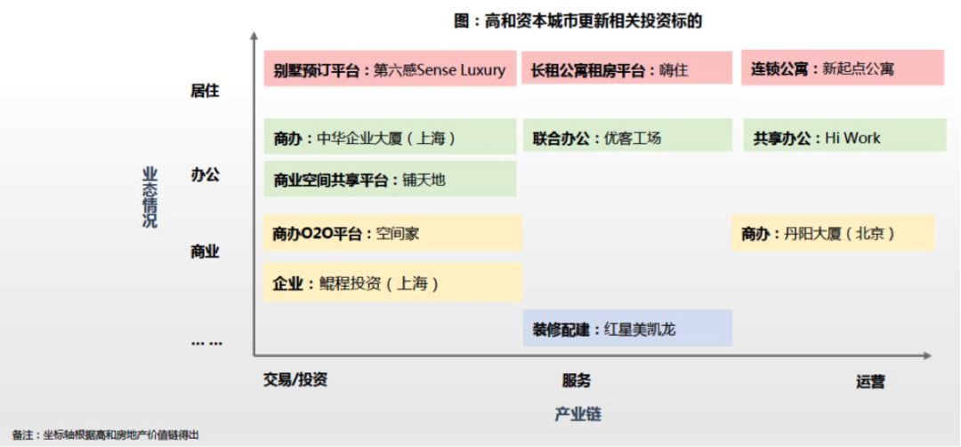 高和投资的居住平台包括别墅预定平台:第六感、长租公寓平台:嗨住、连锁公寓:新起点公寓;办公类包括商办项目中华企业大厦、丹阳大厦、优客工场、Hi Work和商业空间共享平台:铺天地;商业类包括商办o2o平台:空间家、企业:鲲程投资;还有装修类项目:红星美凯龙。