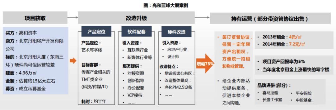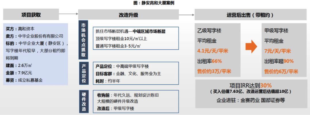 高和联合国开金融于2012年10月收购了上海市南京西路中华企业大厦(现名静安高和大厦)标的约2.6万㎡,交易金额7.9亿元,由于写字楼年代较早,交易价格相对较低,项目从乙级写字楼改造为中高端甲级写字楼后带租约出售,租金涨幅从4.1元/天/平米上涨到7元/天/平米,涨幅达70%,出租率从66%改造后提升到90%,2年内完成退出,IRR达到30%。