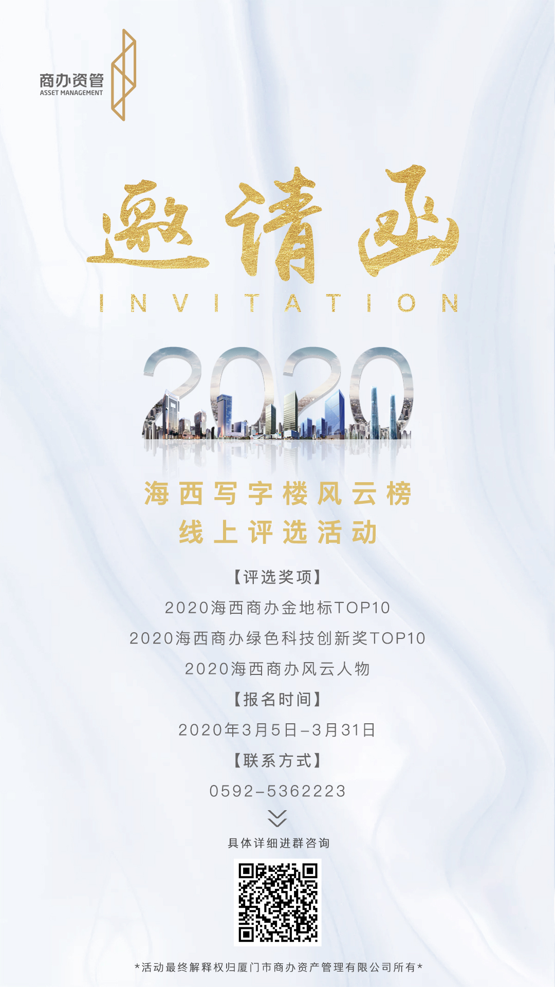 收藏 2020海西写字楼风云榜 发布时间:03-08 21:21 分享到: 写字楼网线上评选活动“2020海西写字楼风云榜”在3月5日开始进入报名阶段,活动将汇聚海西最具影响力的高端楼宇和商办界的风云人物,科技、生态、智能、服务,谁才是商办界最耀眼的明珠?让我们共同期待! 写字楼网线上评选活动“2020海西写字楼风云榜”在3月5日开始进入报名阶段,活动将汇聚海西最具影响力的高端楼宇和商办界的风云人物,科技、生态、智能、服务.....谁才是商办界最耀眼的明珠?让我们共同期待!