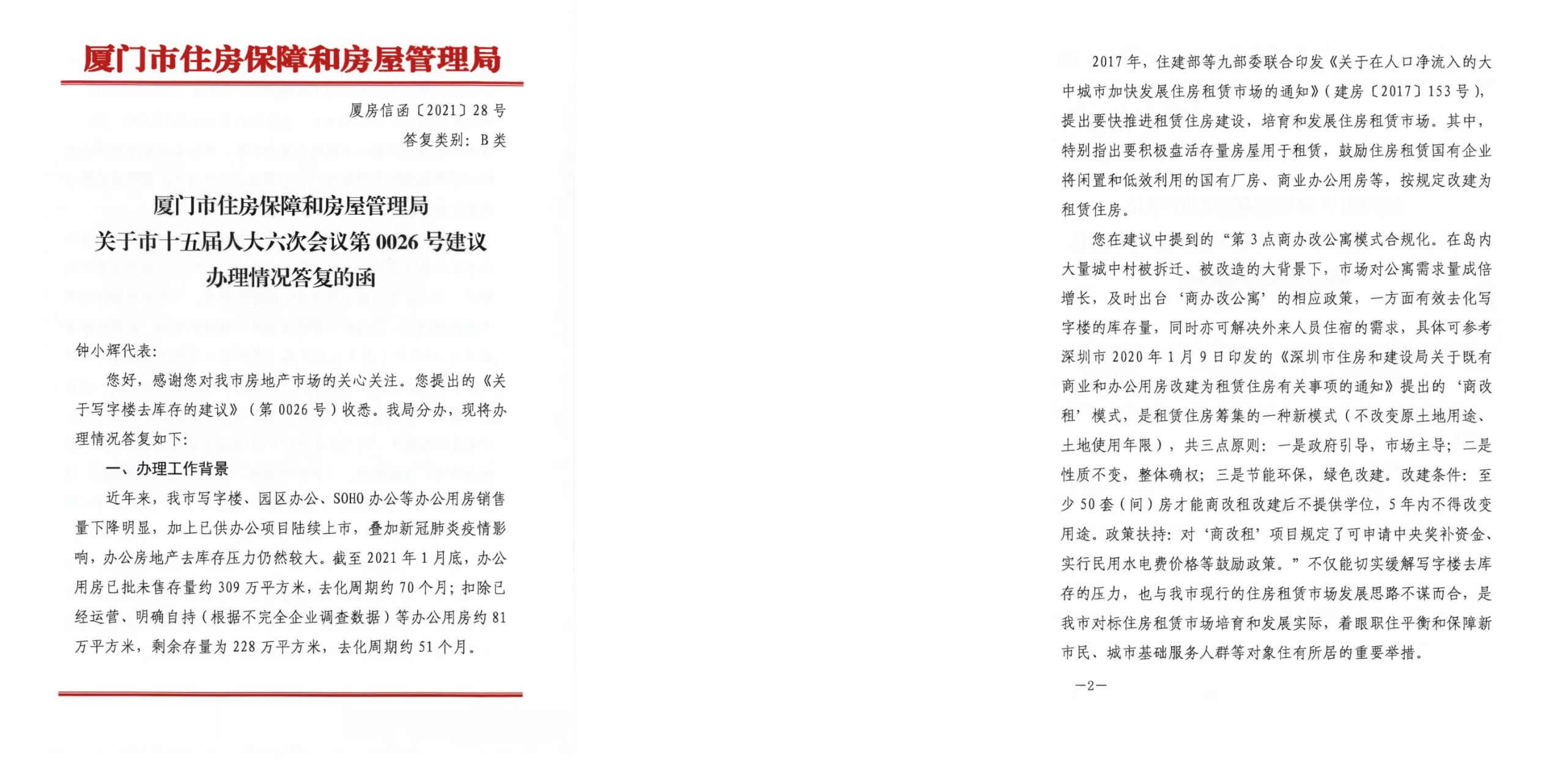 厦门市住房保障和房屋管理局在答复函中称:您提出的《关于写字楼去库存的建议》(第0026号)收悉。我局分办,现将办理情况答复如下: