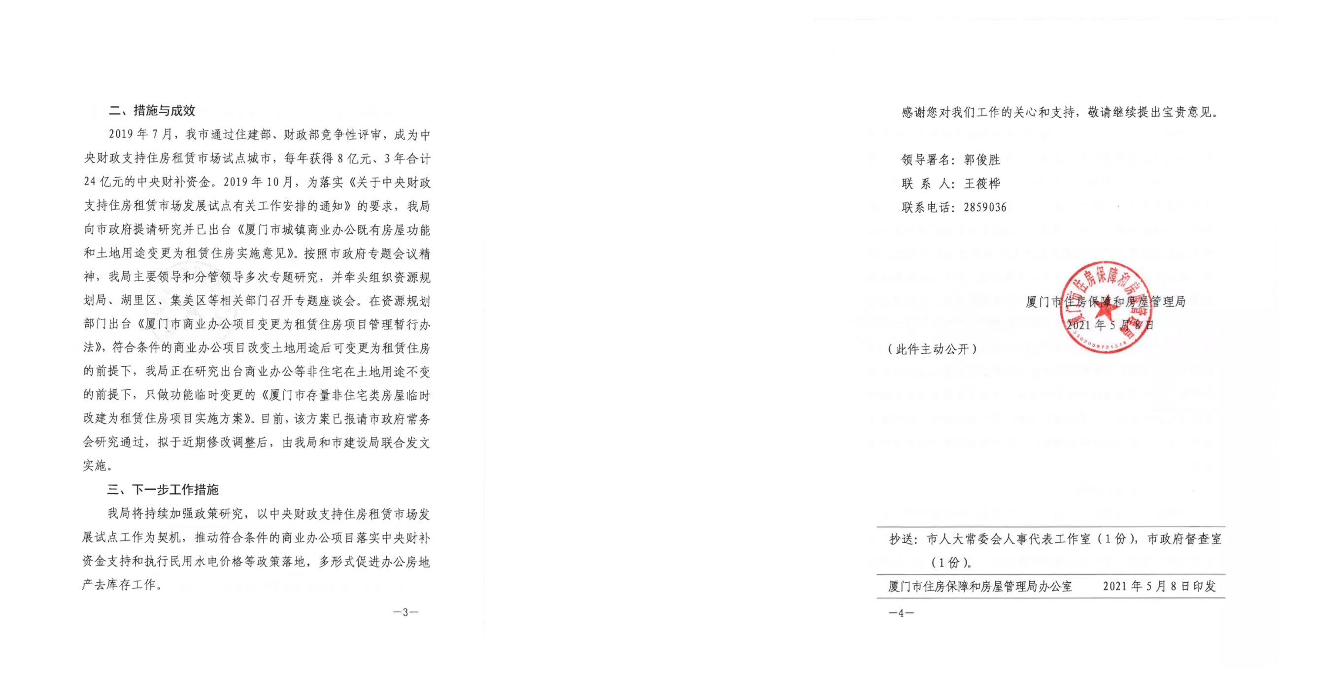 “ 我局正在研究出台商业办公等非住宅在土地用途不变的前提下,只做功能临时变更的《厦门市存量非住宅类房屋临时改建为租赁住房项目实施方案》。目前,该方案已报请市政府常务会研究通过,拟于近期修改调整后,由我局和市建设局联合发文实施。”据福建省厦门市住房保障和房屋管理局网站消息,厦门市住房保障和房屋管理局5月8日向厦门市人大代表钟小辉作出《关于市十五届人大六次会议第0026号建议办理情况答复的函