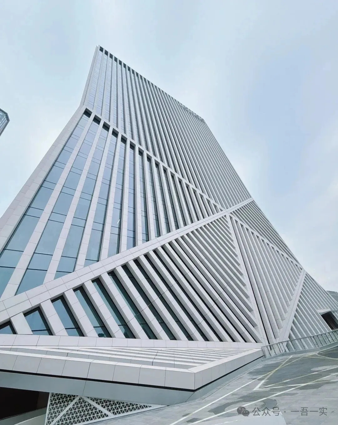 大楼外立面创新性地结合了玻璃幕墙与大型陶板线条,单根陶板截面尺寸600mm×600mm,这种设计不仅在视觉上极具冲击力,同时也兼顾了效率与独特的光影效果。底部的裙楼部分由21个角度各异的三角形玻璃幕墙构成“裙摆”造型,辅以不同倾角的陶板线条,整体灵动而富有韵律感,展现出科技与自然的和谐共生。