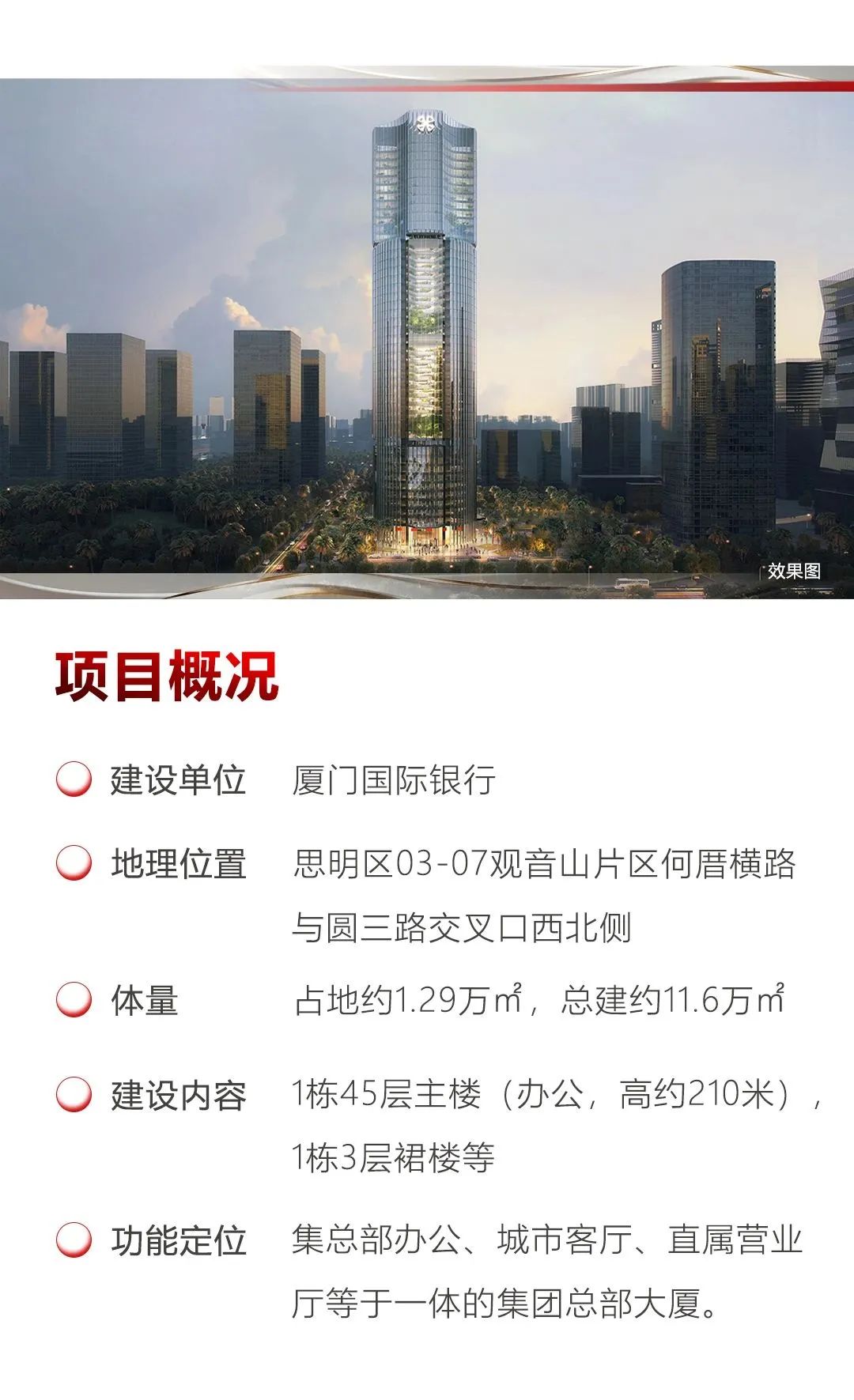该大厦坐落于两岸金融中心何厝片区,建筑高度达210米,总建筑面积约11.55万平方米,建成后将成为集办公、营业厅、会议培训、员工活动等多种功能于一体的集团总部大厦。